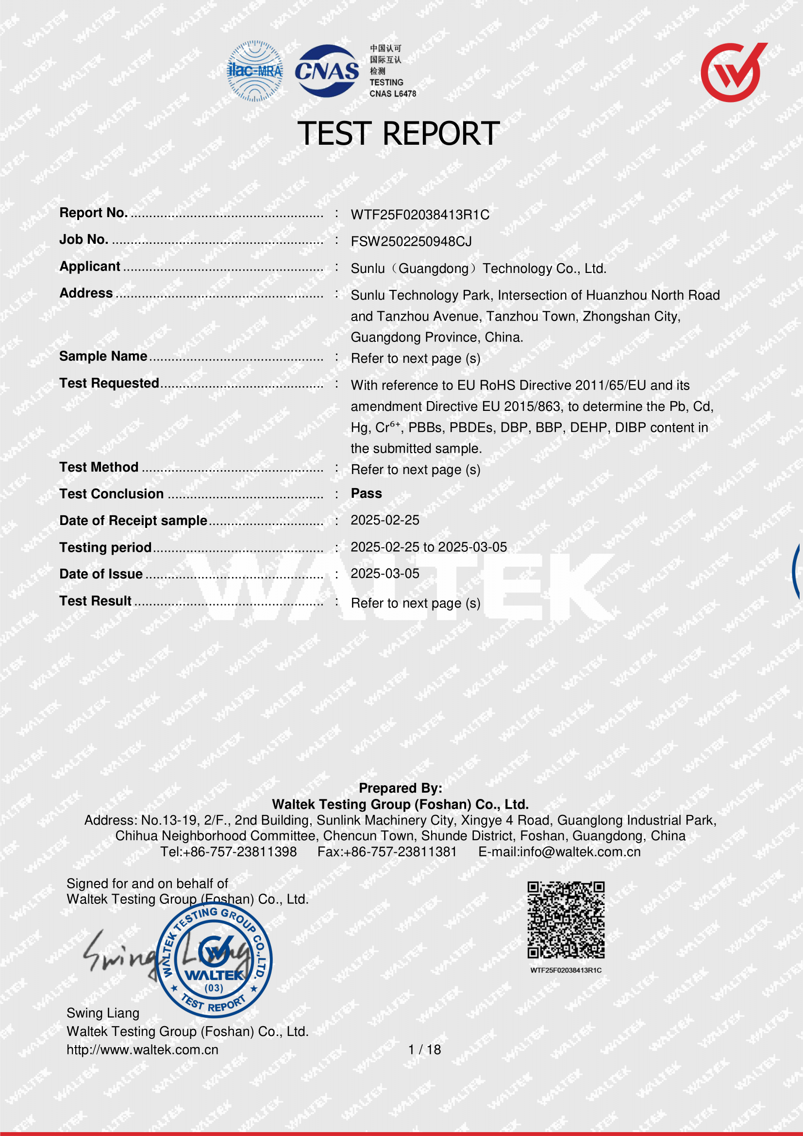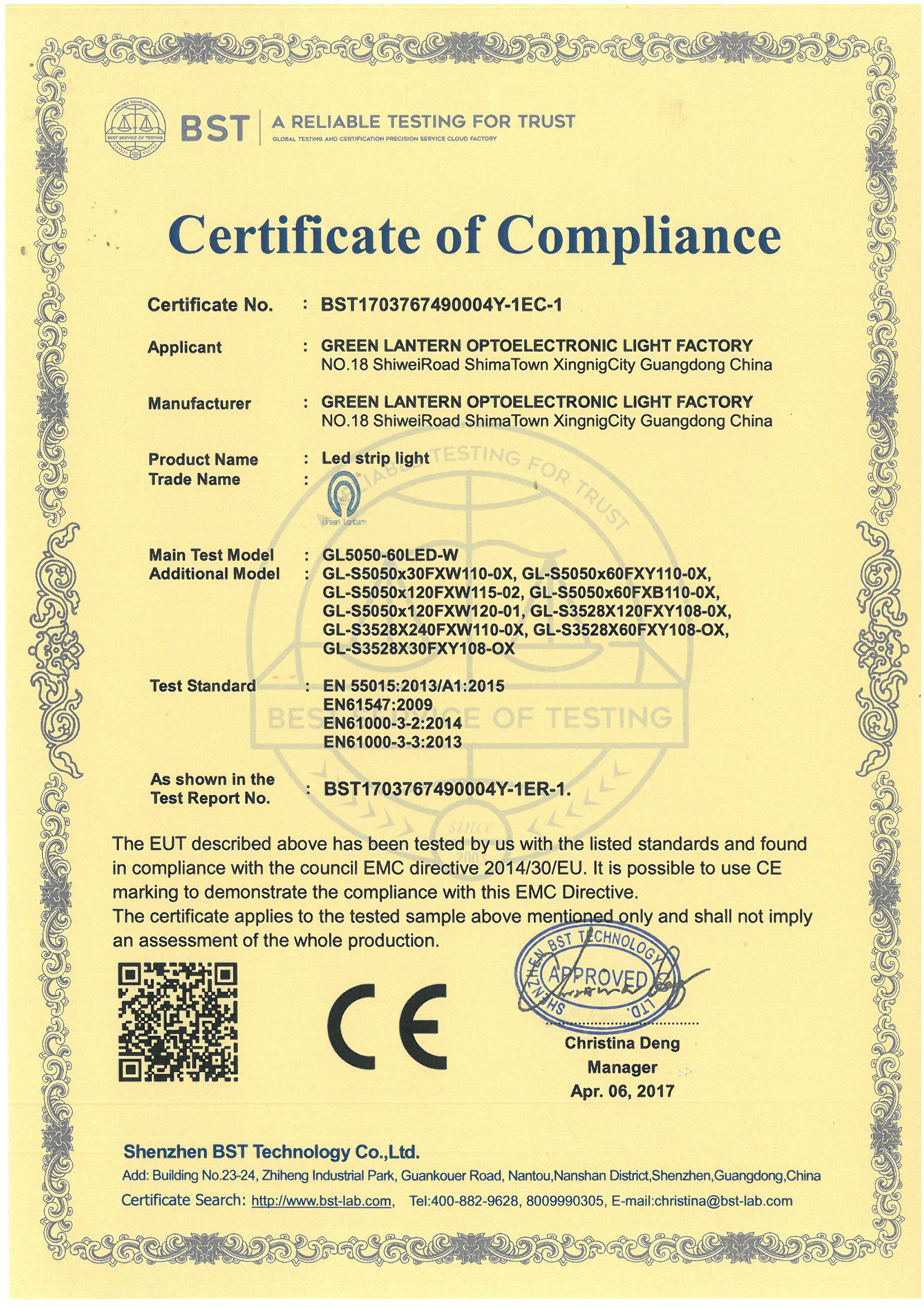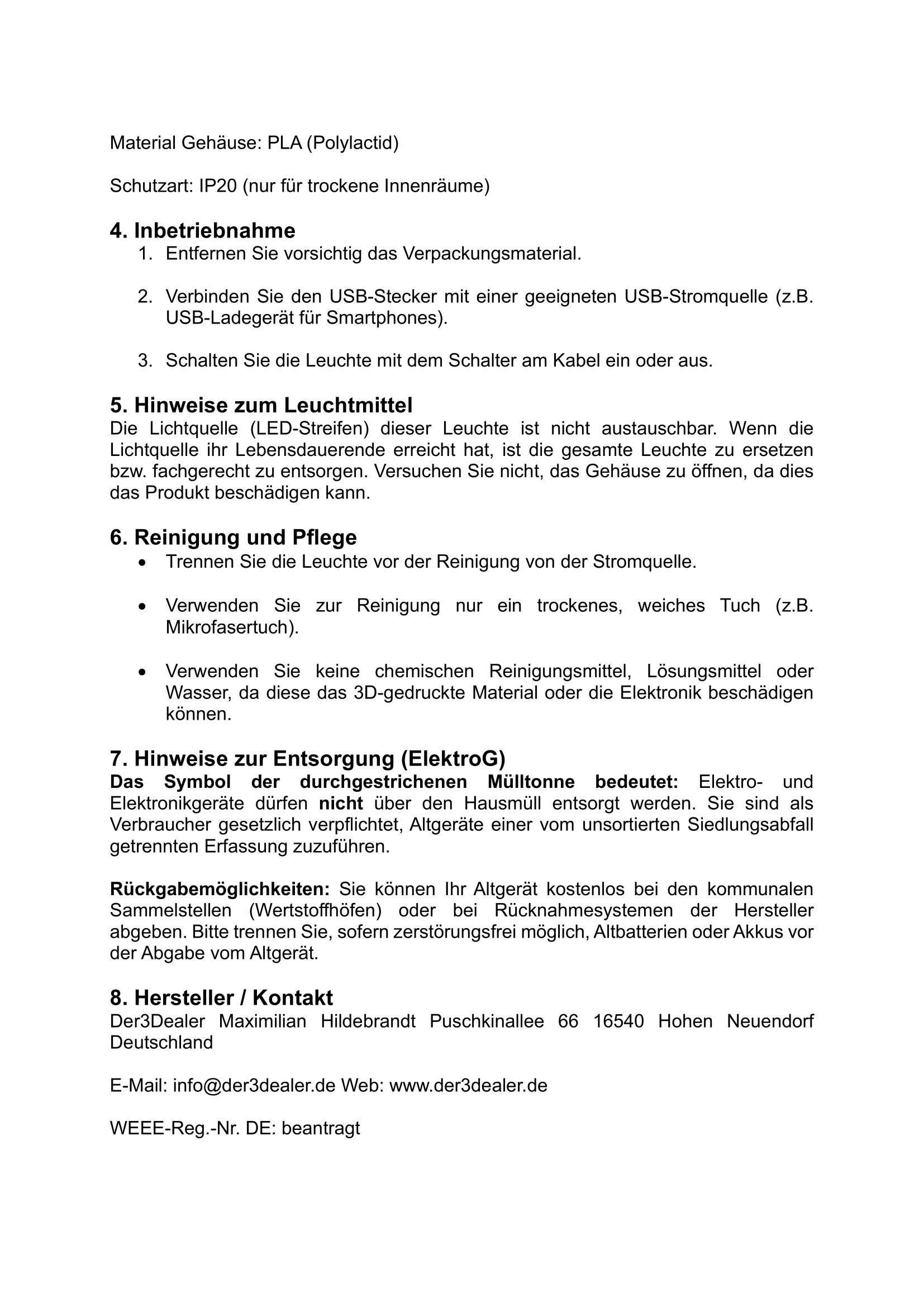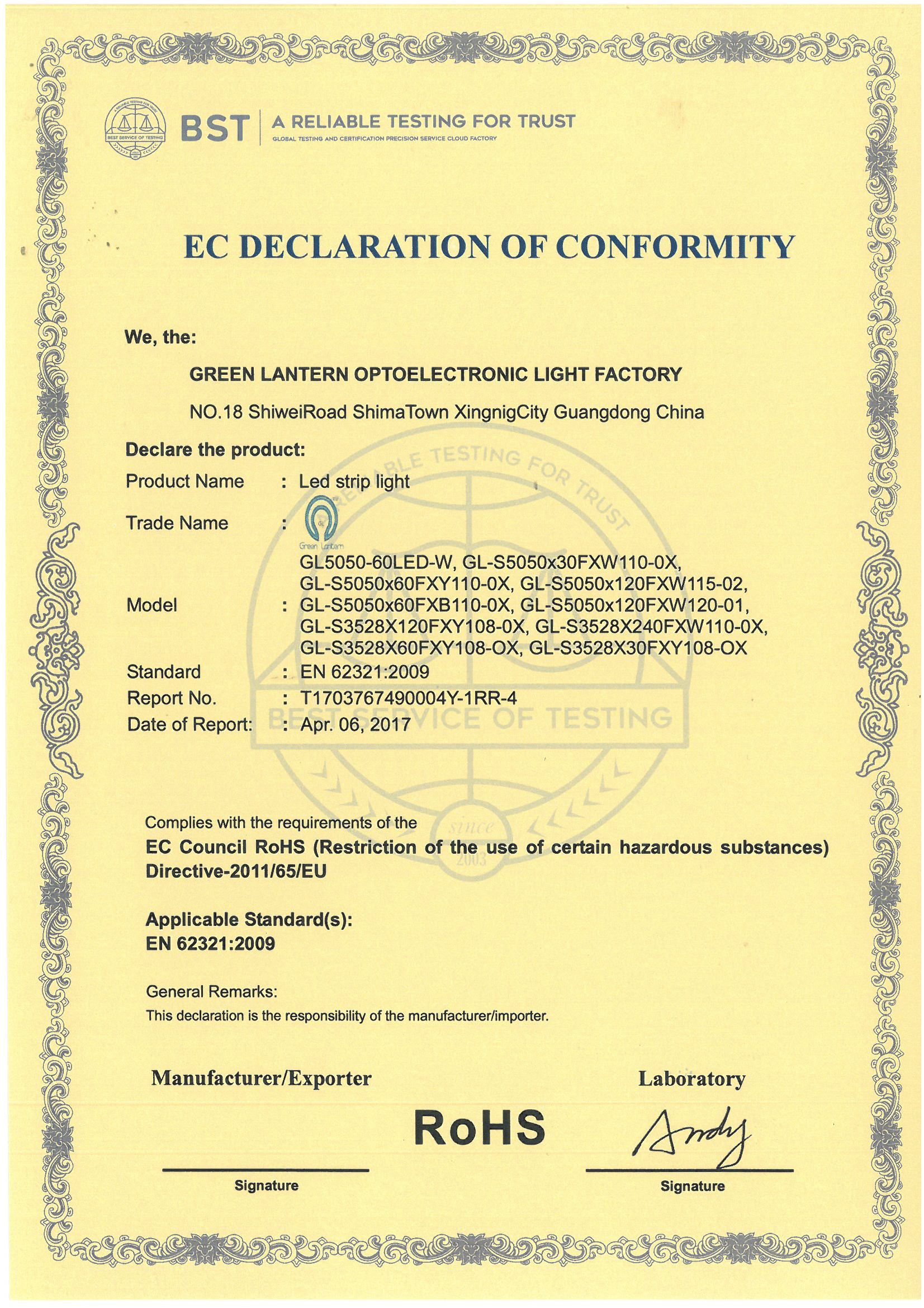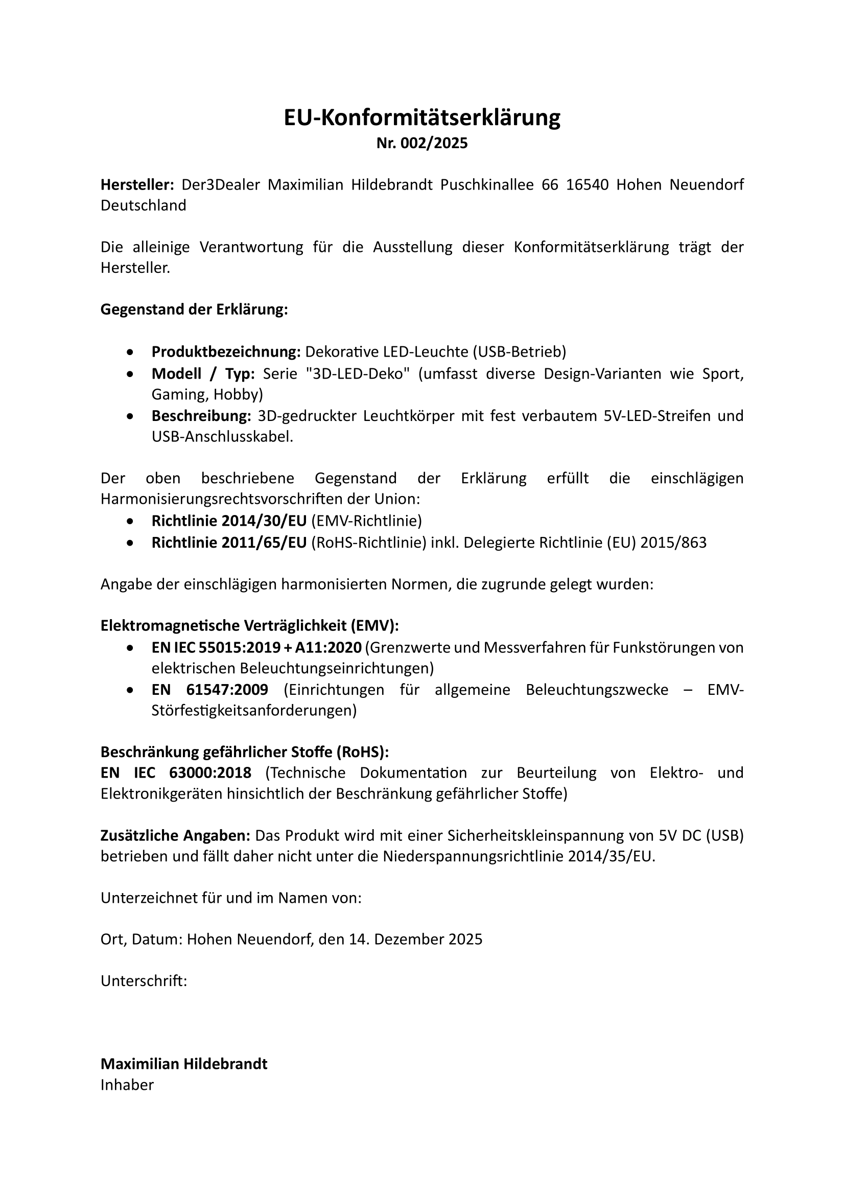CE-Zertifikat und RoHS-Zertifikat der verbauten LEDs sowie der RoHS Test Report des verwendeten PLA Filaments.